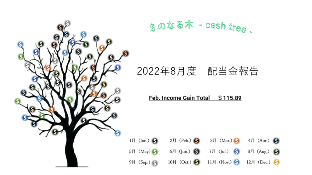 2022年8月度の配当金は110.70$(約14,056円)頂きました。※1$=127円換算