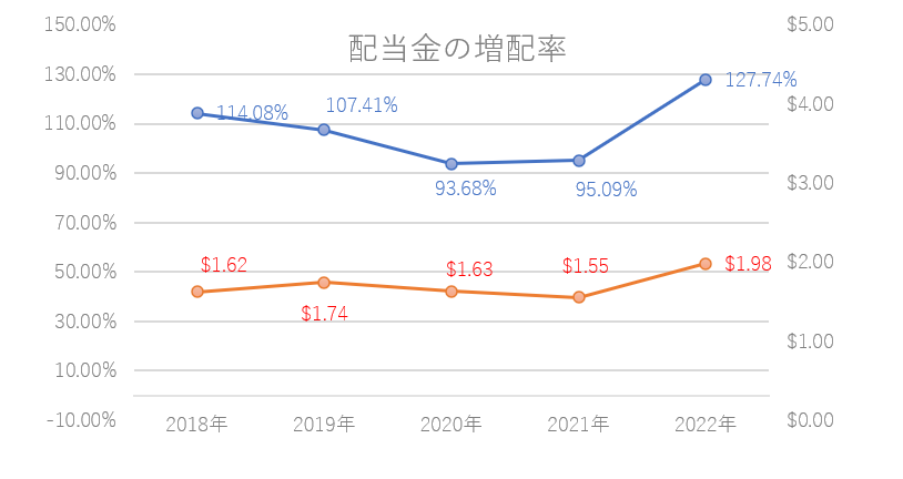 もともと高水準があるがゆえに、株価・配当金の増配率も高くは少ないです。