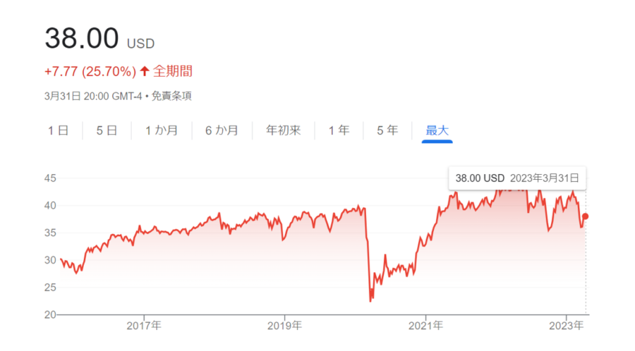 値上がり益を両方狙いたい方は、SPYDへの投資がおすすめではありませんが、当ブログ管理者はコロナショック時の安い時に仕込めたものも一部あるため、株価約24$で購入できたものは利回り8%を超えています。