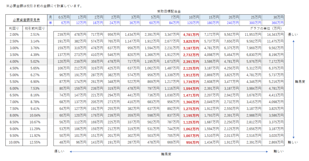 例として、配当利回りが異なると必要金額は大幅に変化します。