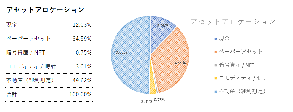 当ブログ管理者の比率は、本業で不動産を行い投資用不動産も所有していることから、投資比率が高くキャッシュ比率は約12%ほどになっています。