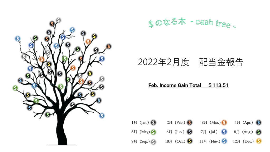 2022年2月度の配当金は113.51$(約13,110円)頂きました。※1$=115円換算