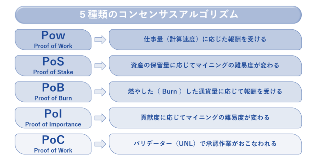 なお、基本の5つのコンセンサスアルゴリズムはこちらです。