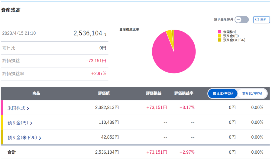 | 口座内合計 | 274,271円 | 251,247円 | +23,535円 | +109.39% |