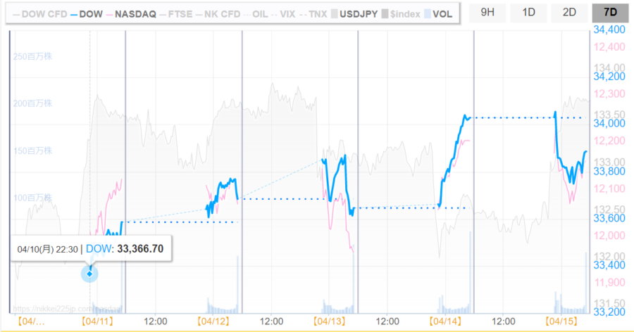 - 開始:「33,366.70ドル」※月曜日22:30(JST)
