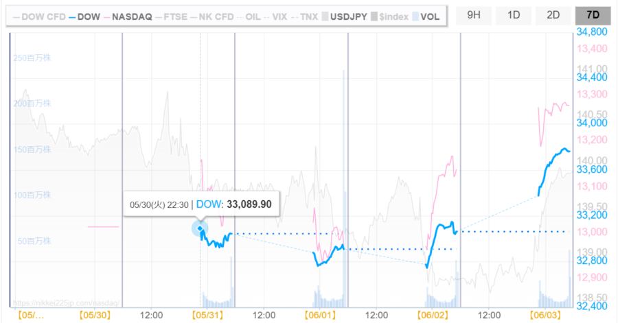 - 開始:「33,089.90ドル」※火曜日22:30(JST)