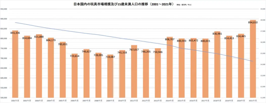 一般社団法人日本玩具協会によると、2021年度の国内玩具市場規模は8,946億円で、前年度比108.5%と過去最高を記録しています。
