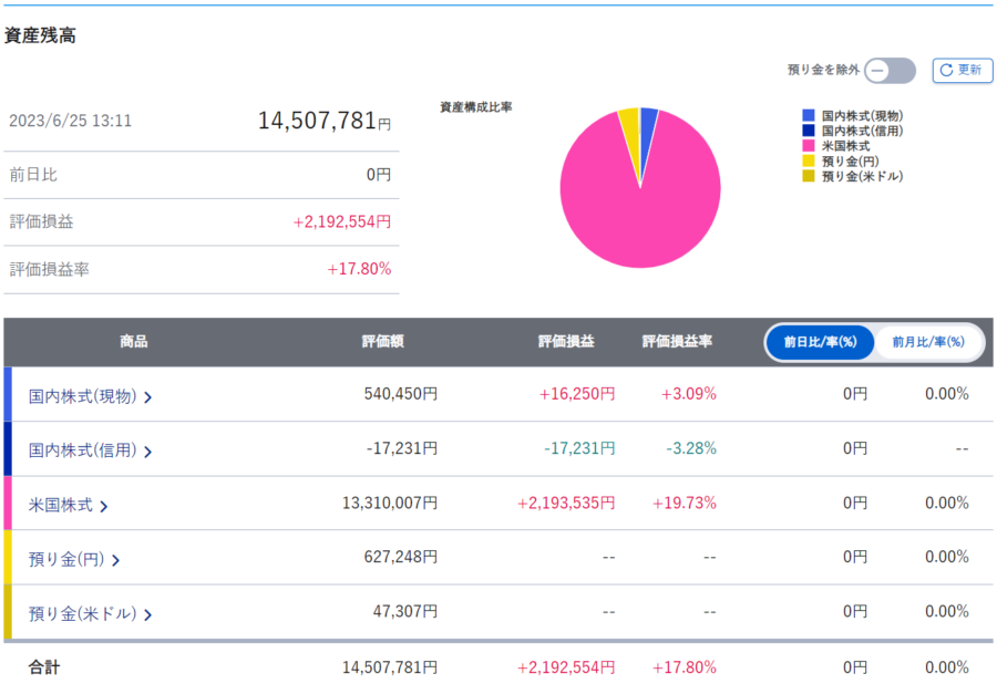 | 口座内合計 | 228,647円 | 228,647円 | +26,391円 | +111.54% |