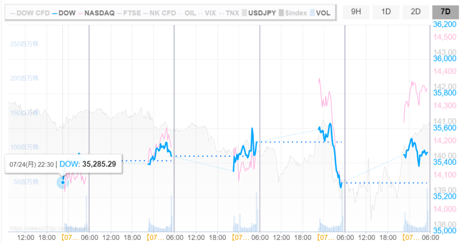 - 終了:「35,459.29ドル」※金曜日5:00(JST)