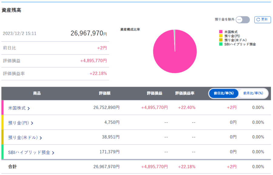 | 米株合計 | 43,617,650円 | 43,411,911円 | +205,739円 | +100.47% |