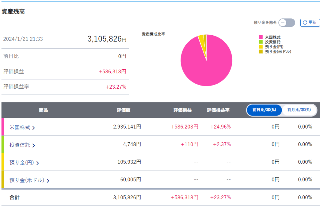 | 米株合計 | 40,686,271円 | 39,711,841円 | +974,430円 | +102.45% |