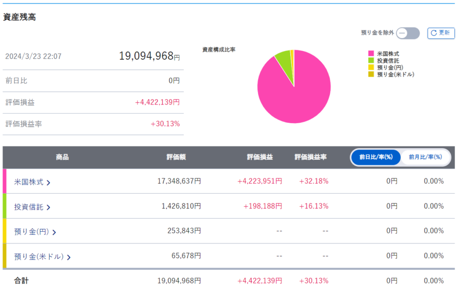 | 口座内合計 | 48,042,349円 | 46,119,476円 | +1,922,873円 | +104.17% |