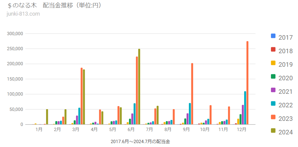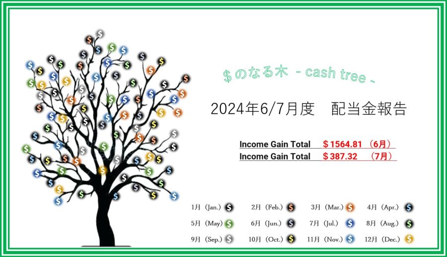 2024年6月度の配当金は1564.81 $(約250,369.6円)頂きました。