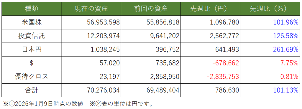 今週は年末年始の影響もあり、約2週間分の資産推移になります。
