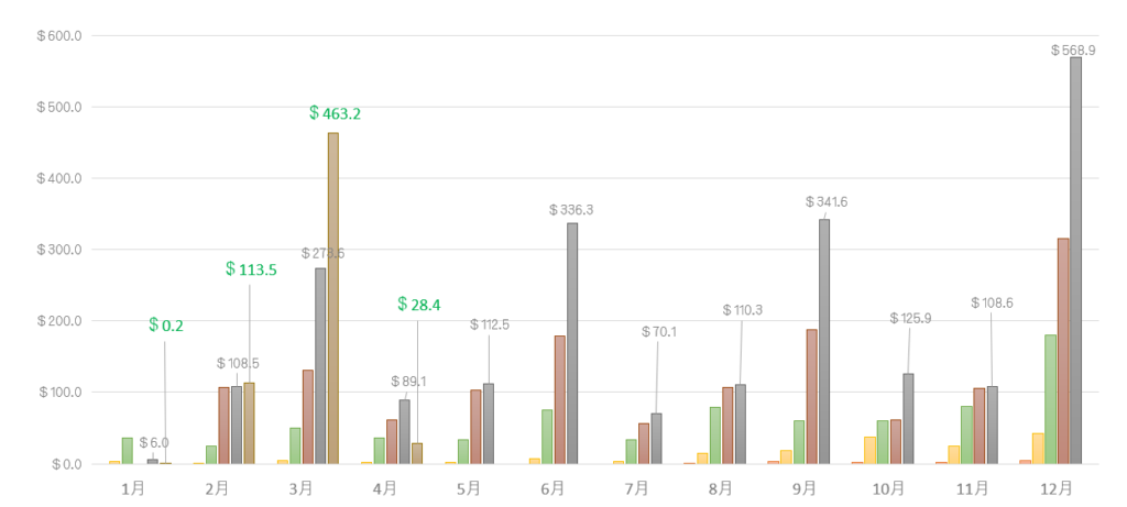 毎年、VOOやVTの入金タイミングが3月から4月にずれ込むため、約10,000円前後が多いこの月ですが、今年はズレが無かったため、4銘柄約3,660円程となっています。