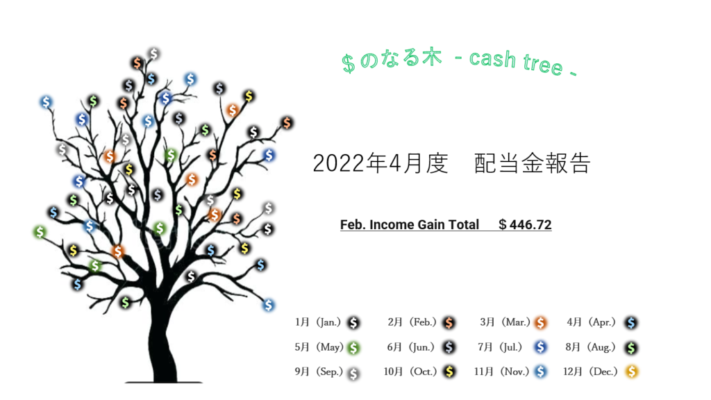 2022年4月度の配当金は28.40$(約3,662円)頂きました。※1$=129円換算