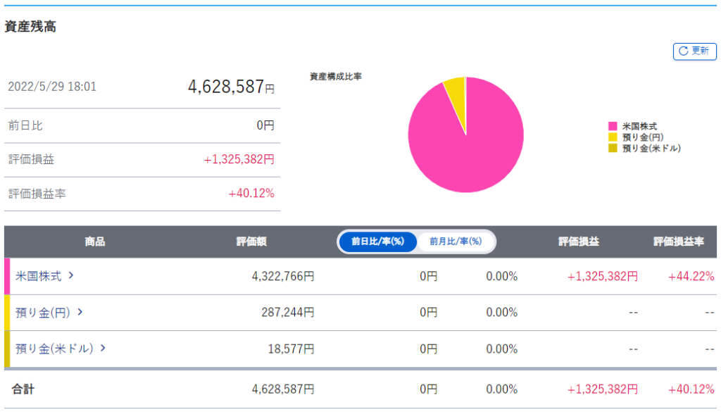 | 証券口座内米ドル | 33,464円 | 33,729円 | ▲265円 | ▲99.21% |