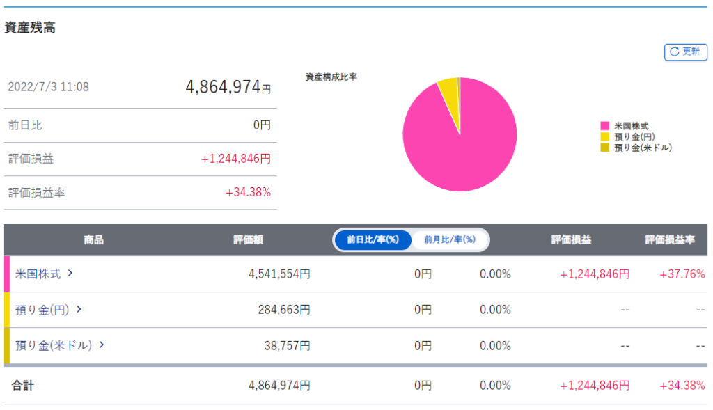 | 証券口座内米ドル | 69,404円 | 61,996円 | +7,408円 | +111.95% |
